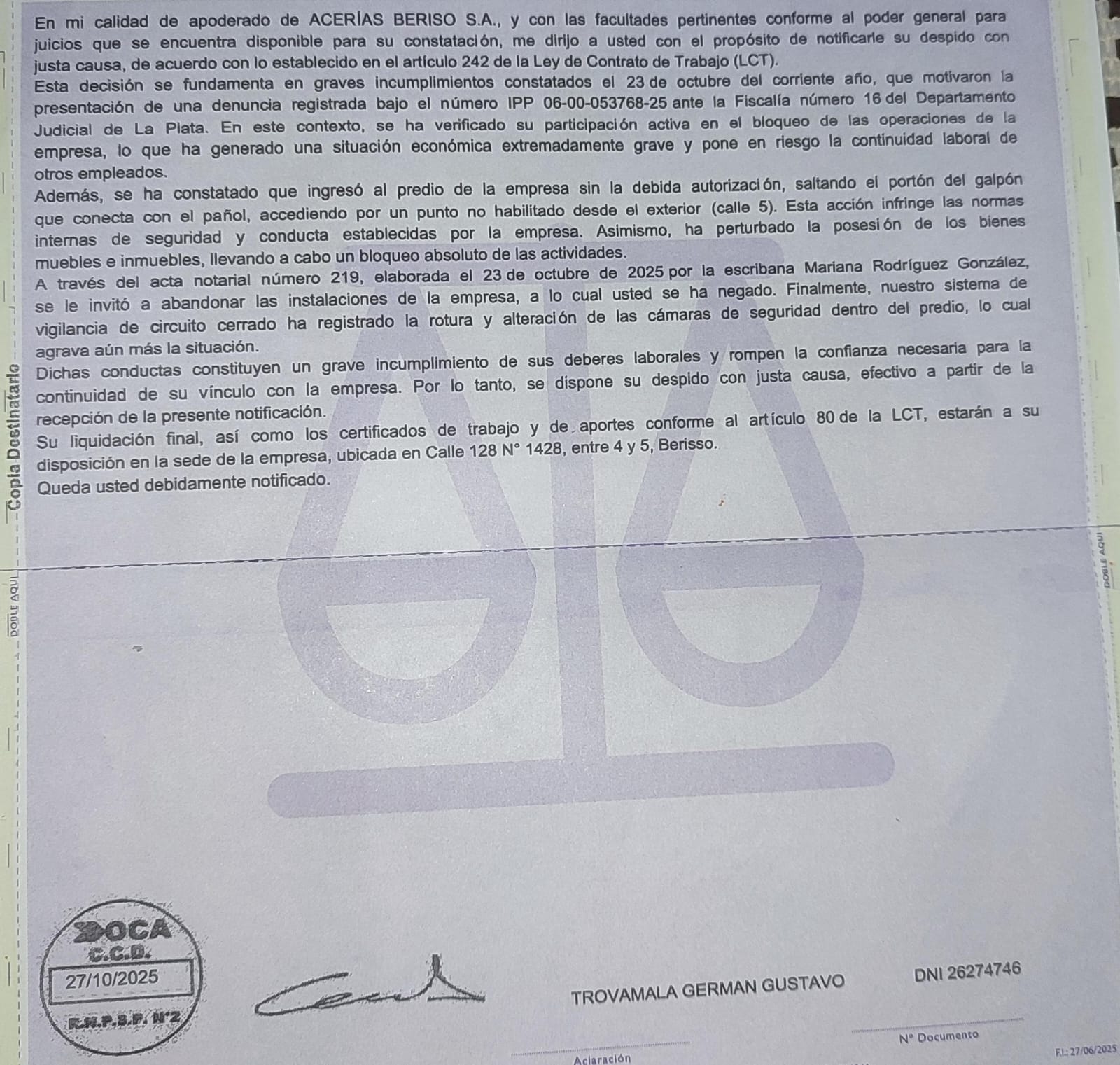 El accionar de Gerosa, Dudiuk y Repicky es una afrenta a la Ley de Contrato de Trabajo y a los mecanismos de diálogo. Al violar la Conciliación Obligatoria, han incurrido en una falta gravísima que, según el derecho laboral, expone a Acerías Beriso S.A. a la nulidad de los 40 despidos, a la obligación de reincorporar inmediatamente a todo el personal, y al pago de los salarios caídos desde la fecha de los telegramas.