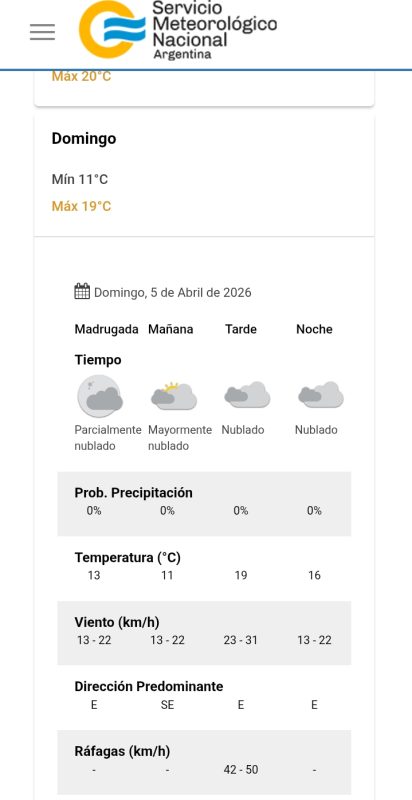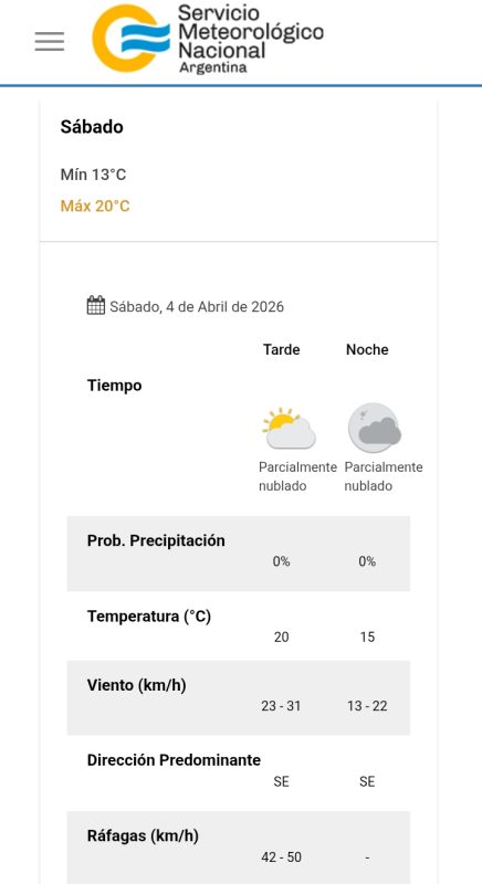 Según los datos oficiales del Servicio Meteorológico Nacional, este sábado 4 de abril comenzó con condiciones mucho más estables y una atmósfera visiblemente más seca, marcada por una humedad del 44% y vientos constantes del sector sur a 26 km/h.
