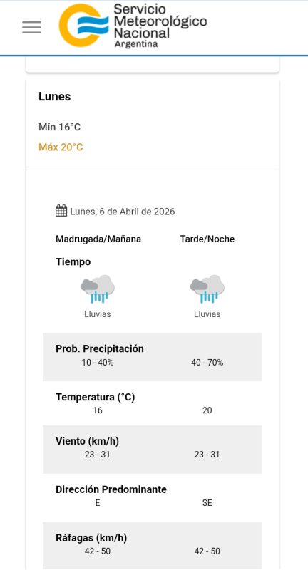 Para el lunes 6 de abril, el Servicio Meteorológico Nacional anticipa el regreso de las lluvias a la región, con una probabilidad de precipitaciones que oscilará entre el 40% y el 70% durante la tarde y la noche. Las temperaturas para ese día se mantendrán entre los 16°C de mínima y los 20°C de máxima, bajo condiciones de viento persistente del sudeste y ráfagas que volverán a superar los 40 km/h, configurando un inicio de semana gris y pasado por agua para los berissenses.