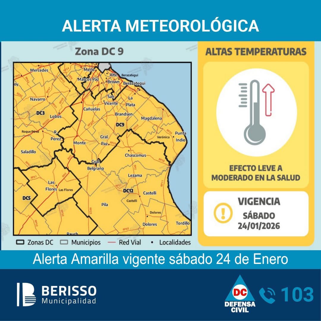 Por otro lado, debido a las condiciones de calor, se solicita a la comunidad extremar las precauciones para evitar incendios. Ante cualquier situación de riesgo o emergencia, se recuerda a la ciudadanía que puede comunicarse al 100 con los Bomberos Voluntarios de Berisso, al 103 con Defensa Civil o al 107 para emergencias de salud.