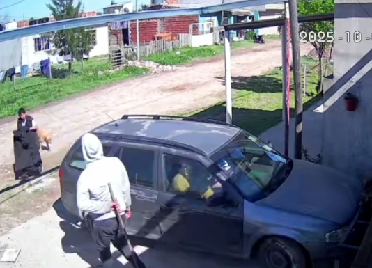 El violento suceso, que tuvo lugar cerca de las 10:00 de la mañana y fue captado por una cámara de seguridad que muestra el momento exacto en que una mujer se dispone a subir a su vehículo estacionado en la entrada de una vivienda. De repente, un joven vestido con un buzo y blanco, con capucha, comienza a acercarse al coche, cuando el dueño de casa, al ver la situación, sale con un palo y pone al delincuente en fuga.