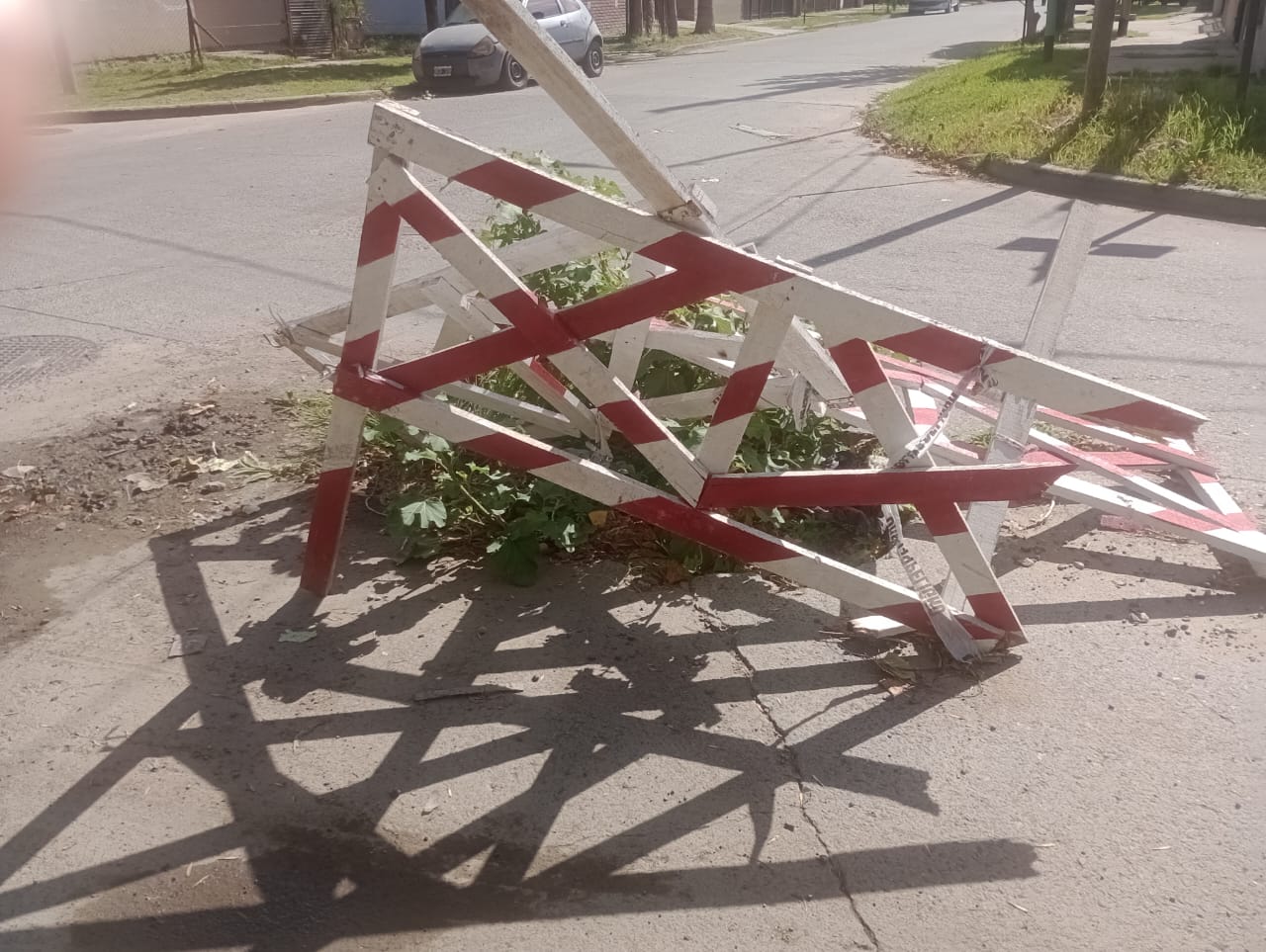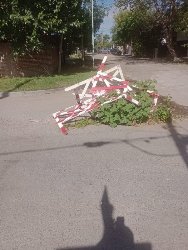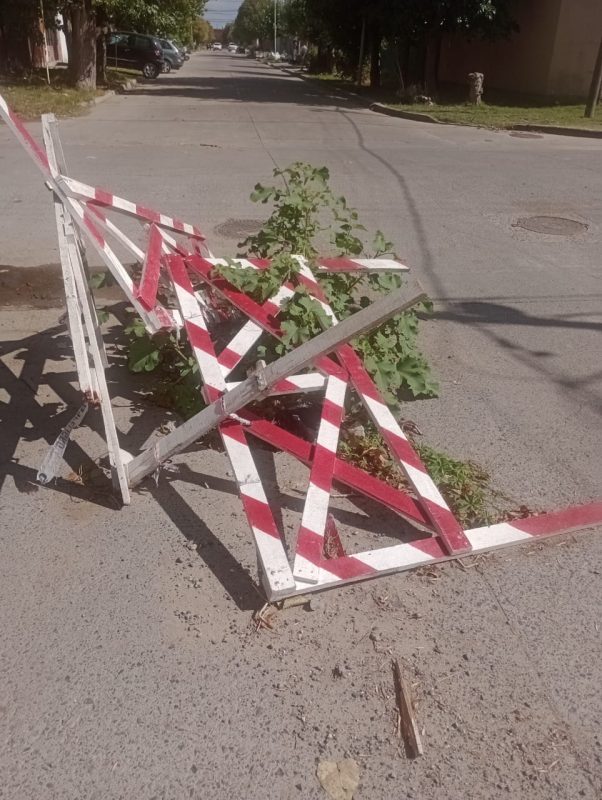 Las imágenes, capturadas por los propios frentistas, son elocuentes. Muestran un pozo o una estructura de obra que quedó inconclusa. Sobre este hueco se apilaron de manera precaria caballetes de señalización de madera, pintados con franjas rojas y blancas, que hoy se encuentran en avanzado estado de deterioro, rotos y desmoronados.
