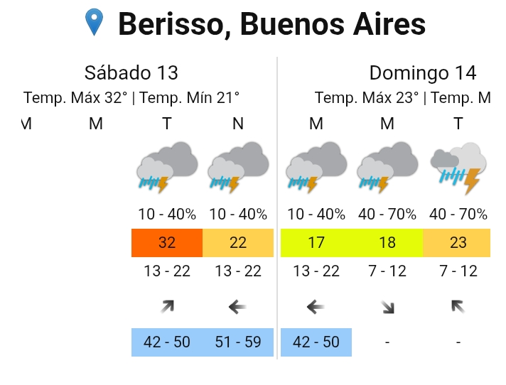 La jornada de éste sábado, 13 de diciembre, se presenta con calor intenso en toda la zona, con máximas que rondarían los 31°C y 32°C en el corredor Berisso-La Plata. Sin embargo, la atención debería centrarse en la tarde-noche, momento en el que se prevé el ingreso de un sistema inestable. Las precipitaciones en forma de chubascos y tormentas estarían en un rango de probabilidad que podría alcanzar el 40% en Berisso, un aviso de lo que vendría después.