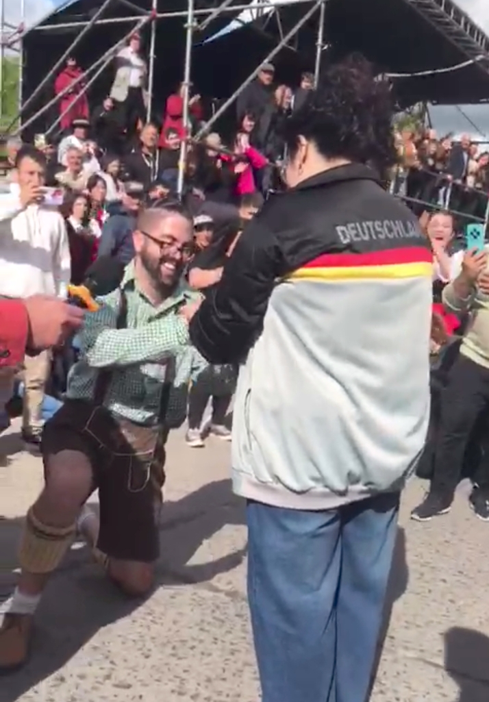 El suceso se desató frente al palco oficial. En el momento capturado por las cámaras y los celulares de los presentes, el joven, Julián Martín Reche, vestido con la tradicional camisa a cuadros verde y tiradores (Lederhosen), se arrodilló en la calle. Con una sonrisa de inmensa felicidad y expectación, sacó de su bolsillo el anillo y se lo ofreció a su pareja. Ella, Nadia Popoff Mallea, con una campera que lucía la bandera alemana y la palabra «DEUTSCHLAND» en la espalda, lo miró con sorpresa y emoción.