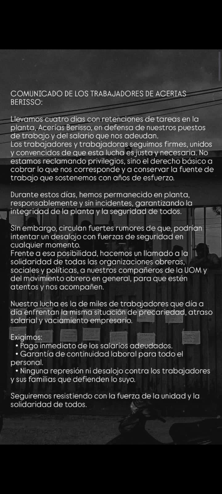 Los trabajadores de la planta Acerías Berisso han emitido un comunicado denunciando una retención de tareas que ya lleva cuatro días, motivada por la falta de pago de salarios adeudados. Los empleados aseguran mantenerse «firmes y unidos» en la defensa de sus puestos de trabajo y el cumplimiento de sus derechos laborales.