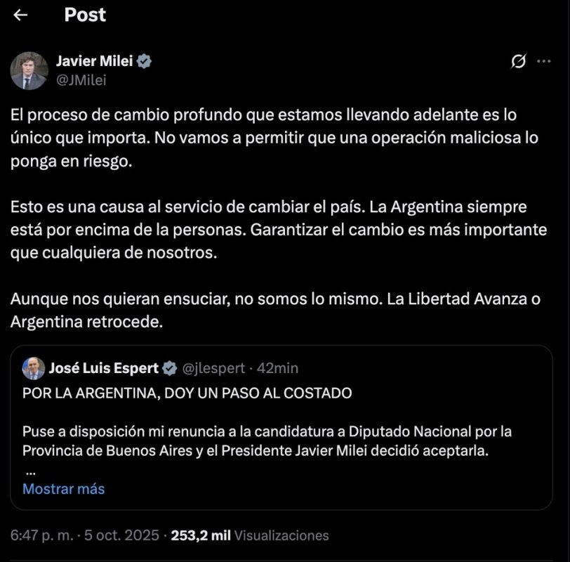 Con tono desafiante, Javier Milei se refirió a la renuncia de Espert y buscó dejar claro que el rumbo del gobierno no se modificará. “El proceso de cambio profundo que estamos llevando adelante es lo único que importa. No vamos a permitir que una operación maliciosa lo ponga en riesgo,” aseguró el mandatario en un mensaje difundido desde Casa Rosada.