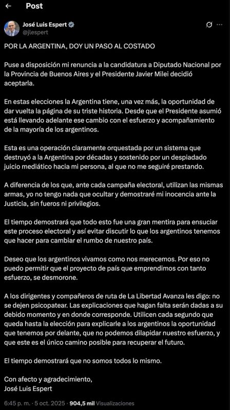 En su mensaje, Espert aseguró que su decisión responde a un intento de “no perjudicar el proyecto de país” impulsado por el presidente Milei. “Puse a disposición mi renuncia y el Presidente decidió aceptarla”, escribió, señalando que enfrentará la Justicia “sin fueros ni privilegios” y que el tiempo “demostrará que todo esto fue una gran mentira”.