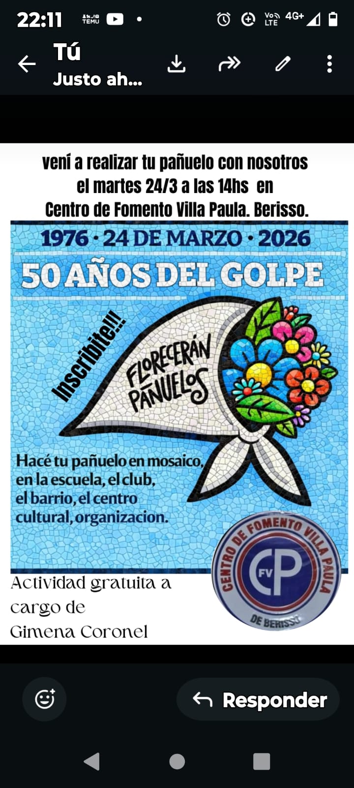 En el marco de la conmemoración de los 50 años del golpe de estado cívico-militar en Argentina (1976-2026), el Centro de Fomento Villa Paula en Berisso se prepara para una jornada especial de reflexión y creación artística colectiva.