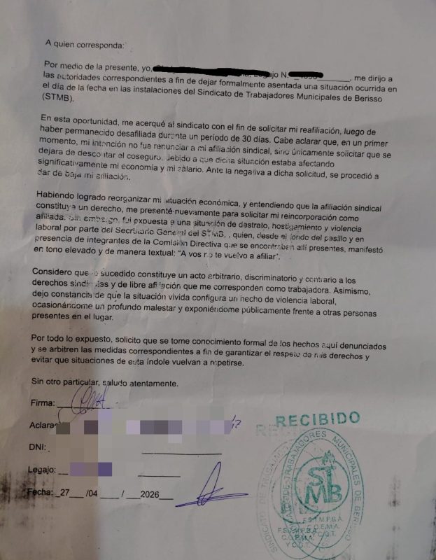 La trabajadora, quien ha realizado y formalizado una denuncia pública en el Gremio que nuclea a los empleados municipales de Berisso, expresó haber vivido una situación de maltrato al intentar ejercer su derecho de reafiliación a la organización gremial.